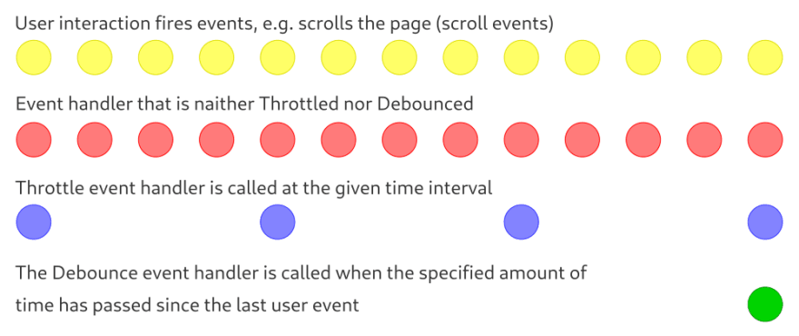 scroll, resize, input, mousemove 같은 이벤트는 짧은 시간 간격으로 연속해서 발생한다. 이러한 이벤트에 바인딩한 이벤트 핸들러는 과도하게 호출되어 성능에 문제를 일으킬 수 있다. 디바운스와 스로틀은 짧은 시간 간격으로 연속해서 발생하는 이벤트를 그룹화해서 과도한 이벤트 핸들러의 호출을 방지하는 프로그래밍 기법이다.