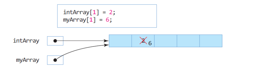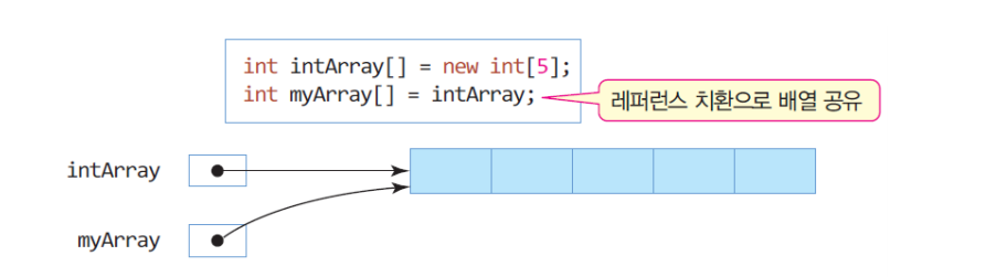 레퍼런스 변수를 선언하고 배열 공간을 할당한 상태에서 새로운 레퍼런스 변수에 동일한 배열 공간을 참조하도록 하였다. 위의 상황에서 두 변수는 하나의 배열을 가리키게 된다. 배열이 복사되는 것이 아니라, 배열에 대한 주소만 복사된다.