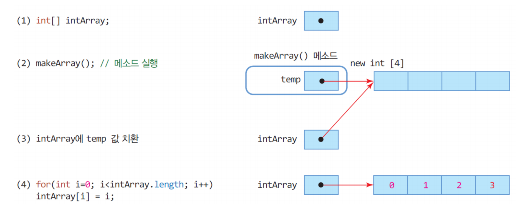 메소드에서 배열을 리턴하는 경우, 배열 공간 자체를 리턴하는 것이 아닌 배열에 대한 레퍼런스를 반환한다.