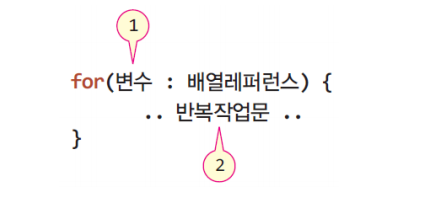 for-each문을 통해 배열 원소에 순차접근할 수 있다. 다음과 같은 구조를 갖는다.