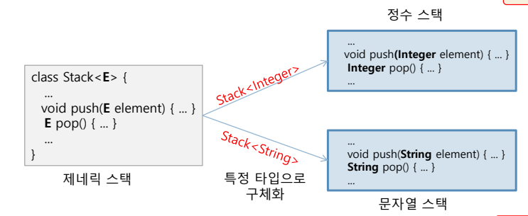 일반화한 타입 E를 두고, Stack<Integer>와 같이 E에 구체적인 타입을 지정하면 구체화된 스택이 된다.