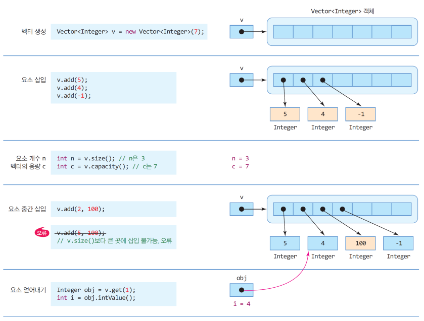 Integer obj = v.get(0); //벡터의 0번째 객체 반환