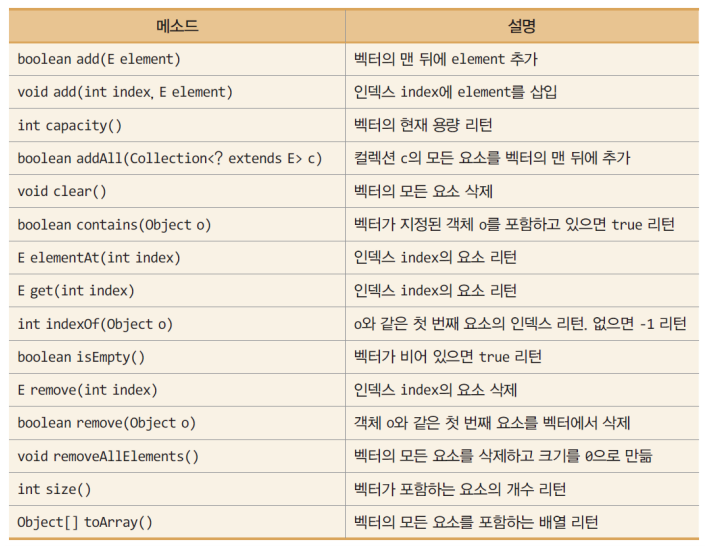 Vector<E>는 배열을 가변 크기로 다루며 객체의 삽입, 삭제, 이동이 쉽다. 벡터는 삽입되는 요소의 개수에 따라 자동으로 크기를 조절하며 요소의 삽입, 삭제에 따라 자동으로 자리가 이동된다.
