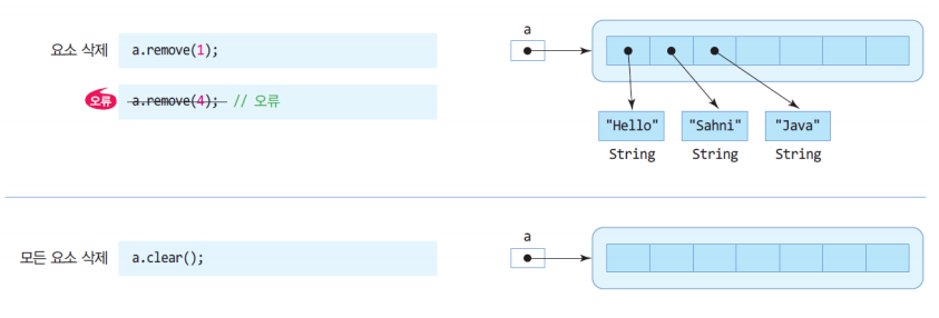 remove() 메소드를 이용해 ArrayList 특정 위치의 요소를 삭제할 수 있다. ArrayList의 모든 요소를 삭제하려면 clear() 메소드를 호출한다.