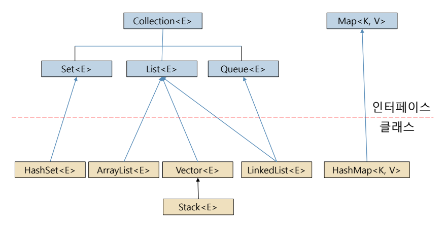 모든 컬렉션 클래스들은 Collection<E>를 상속받는다. Vector<E>와 ArrayList<E>는 가변 크기 배열, LinkedList<E>는 링크드 리스트, Stack<E>은 스택, HashSet<E>은 집합을 구현하며 HashMap<k, V>은 키와 값의 쌍으로 이루어진 데이터를 저장하는 컬렉션이다.