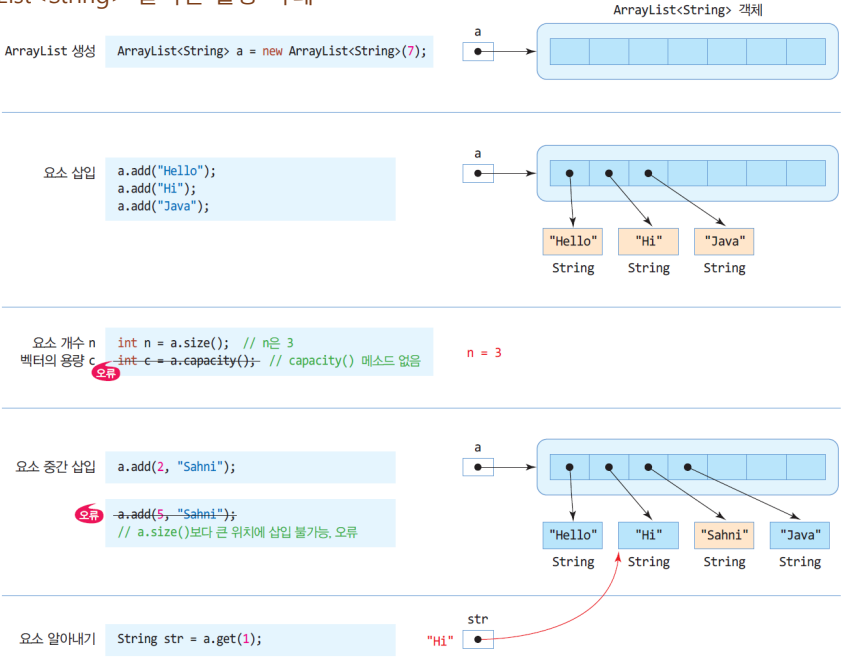 ArrayList에 String이 아닌 다른 값이나 객체를 삽입하면 오류가 발생한다. ArrayList에도 null을 삽입할 수 있다.