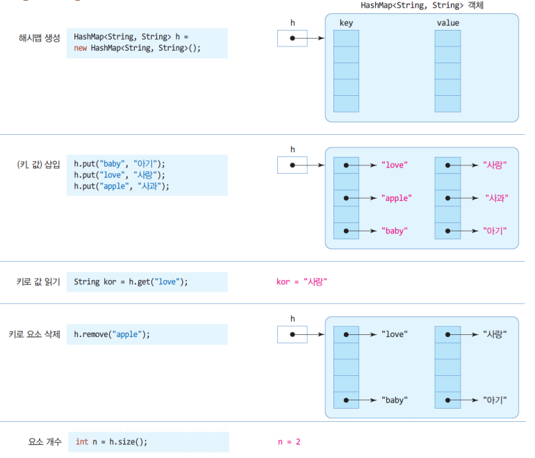해시맵 컬렉션을 생성하고 요소를 삽입, 삭제하는 과정은 다음과 같다.