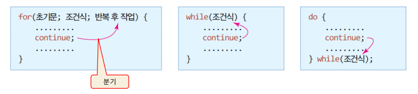 반복문에서 continue문을 만나는 경우 이후의 문장을 실행하지 않고 다음 반복으로 바로 넘어가도록 한다.