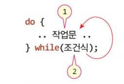 do-while문은 while문과 다른 부분은 유사하지만, 조건 검사를 하기 전에 작업문이 먼저 실행된다는 점에서 차이가 있다. 조건이 참이던 거짓이던지 간에 우선 작업문을 1회 실행한 뒤 검사한다.