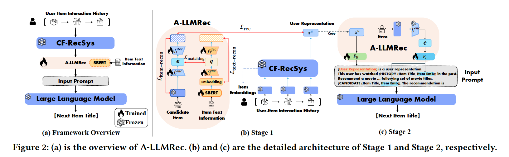 A-LLMRec는 두 단계로 구성된 구조를 가집니다. 이 구조는 각각 협업 필터링과 언어 모델의 강점을 살려 정보를 처리하는 방식입니다.