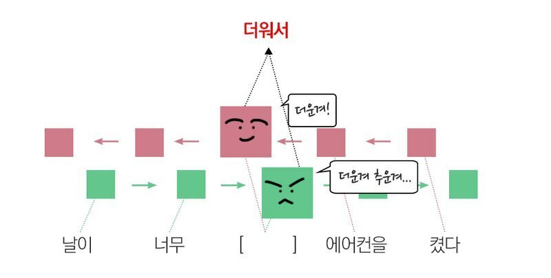 순차 RNN으로만 하면 날이, 너무만 보고 날씨의 상태를 파악해야하지만 양방향 학습을 이용하면 켰다, 에어컨을 보고 날씨의 상태를 더 잘 유추할 수 있습니다