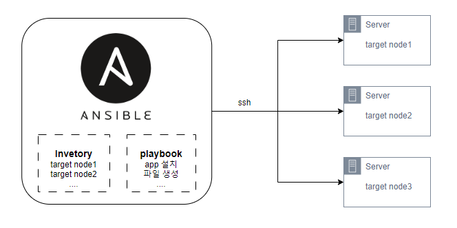 Ansible 이 설치된 서버로 target node(원격지 서버) 들에게 명령을 전달한다.