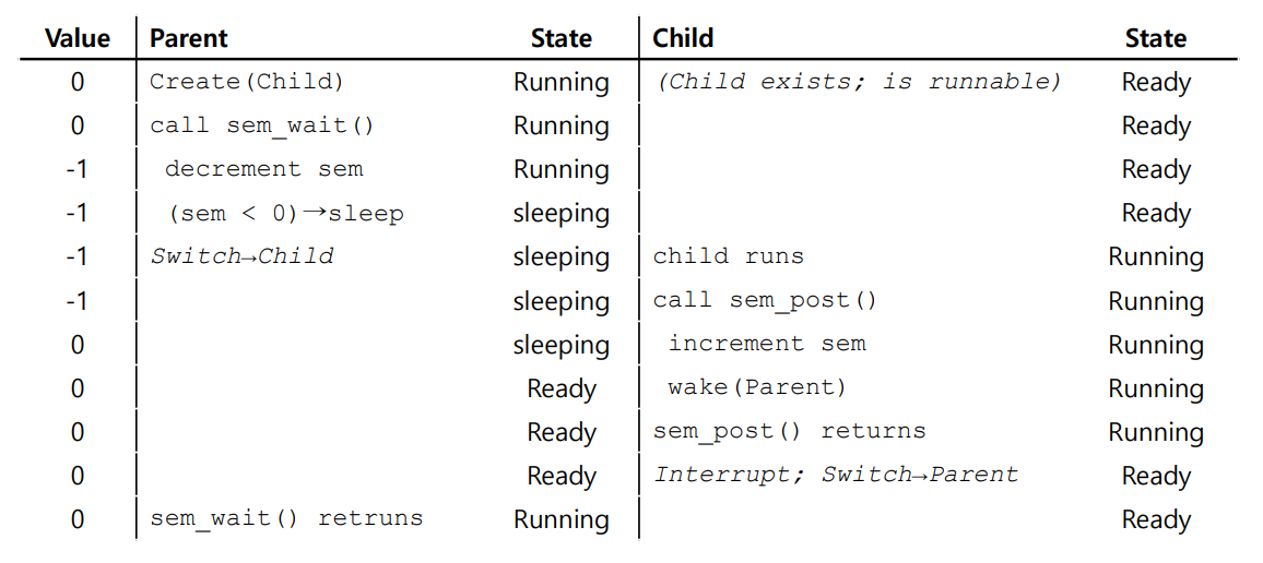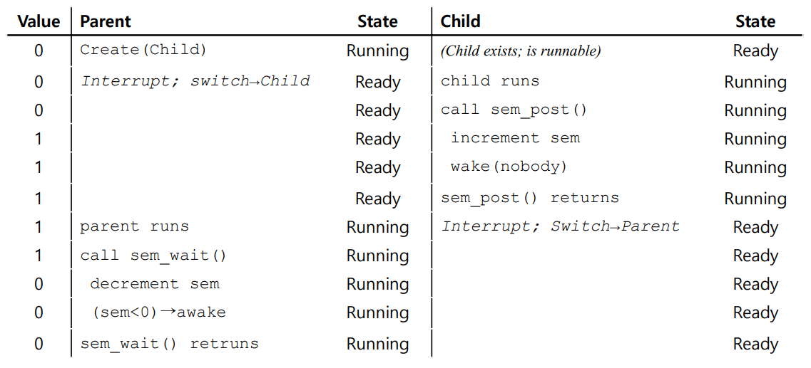다시 부모 스레드로 컨텍스트 스위칭되어 sem_wait()을 호출하였다. 하지만 자식 스레드로 인해 현재 세마포어의 값은 1이기 때문에, 부모 스레드는 잠들지 않고 작업을 완료할 수 있게 된다.