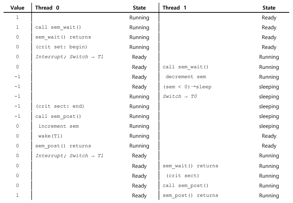 즉, Zemaphore에서는 대기 중인 스레드 수를 직접 추적하지 않고, 세마포어 값이 음수가 되는 것을 방지한다. 이는 세마포어를 더 간단한 방식으로 구현할 수 있도록 하는데, 현재 리눅스 구현과 일치한다.