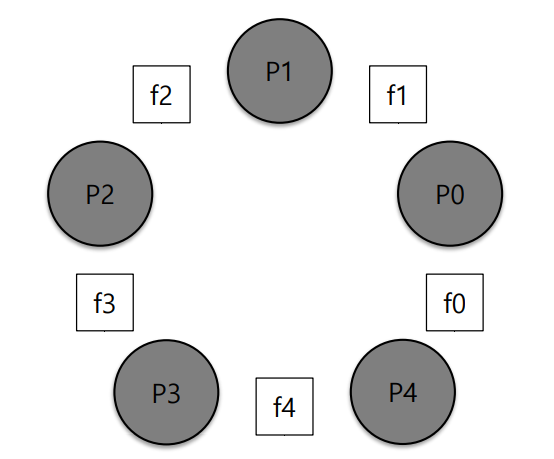 원탁에 철학자들(P0~P4)와 포크(f0~f4)가 있을 때, 철학자들이 음식을 먹기 위해 두 개의 포크를 짚는 과정을 수도 코드로 나타내면 아래와 같다. (각 철학자는 음식을 먹기 위해 두 개의 포크 모두 필요하다고 가정한다.)