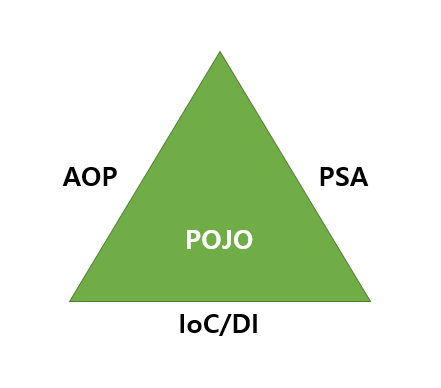 Spring Framework의 특징은 흔히 위의 그림으로 표현된다. 위의 그림은 Spring Framework의 주요 특징인 POJO, IoC, DI, AOP, PSA를 내포하고 있다.