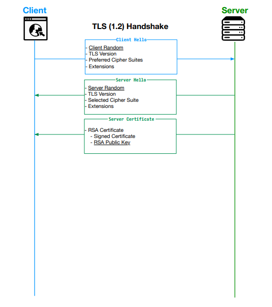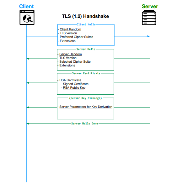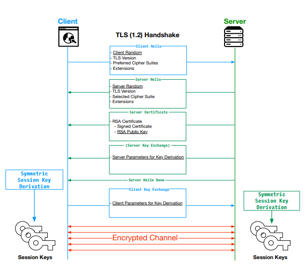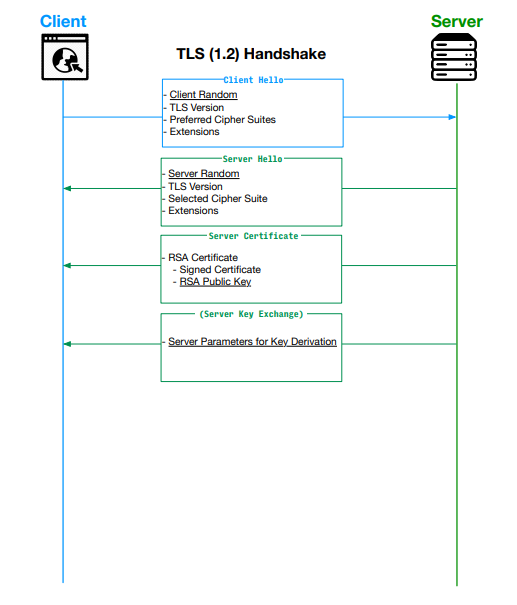 RSA 공개키 방식을 사용하여 서버의 신원을 확인하고, Diffie-Hellman 키 교환을 사용하여 클라이언트와 서버 간의 비밀 공유 키를 교환한다.