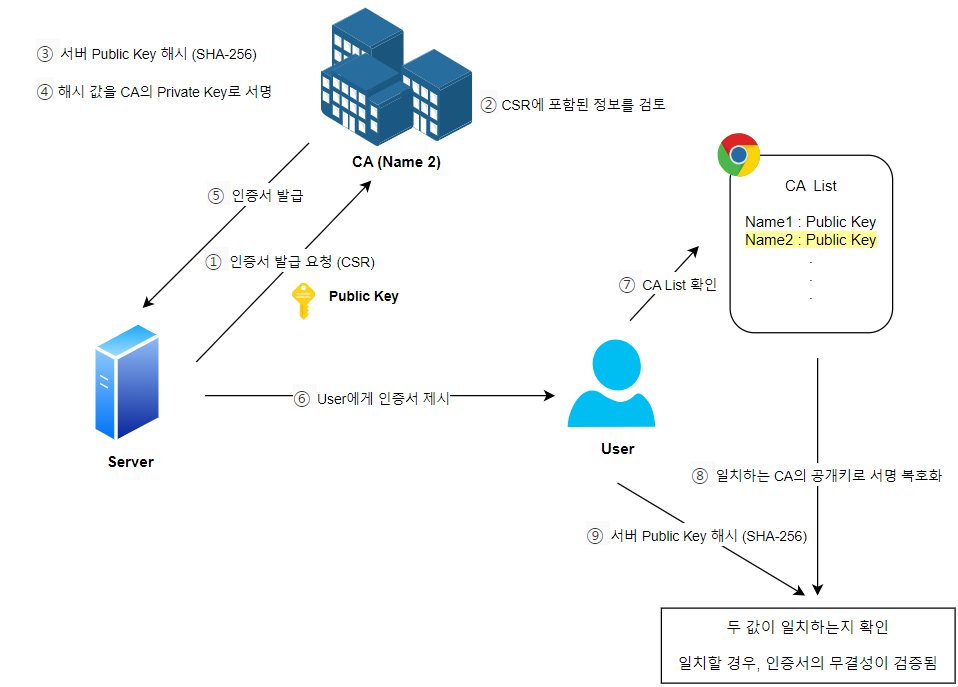 클라이언트는 서버의 공개키를 해시한 후, 8번의 결과와 비교한다. 두 결과가 같을 경우, 해당 인증서가 위조되지 않았음을 인증하게 되는 것이다.