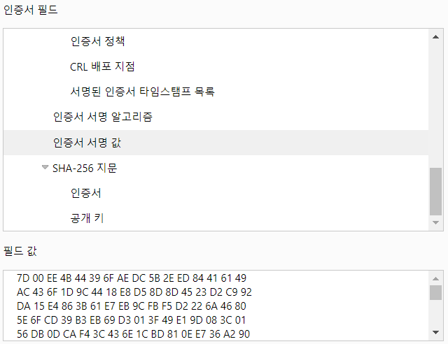 인증서의 세부 정보 항목에서는 인증서 서명 값 또한 확인할 수 있다. 지문과 서명의 차이는 아래의 인증서 발급 과정에서 알아보자.