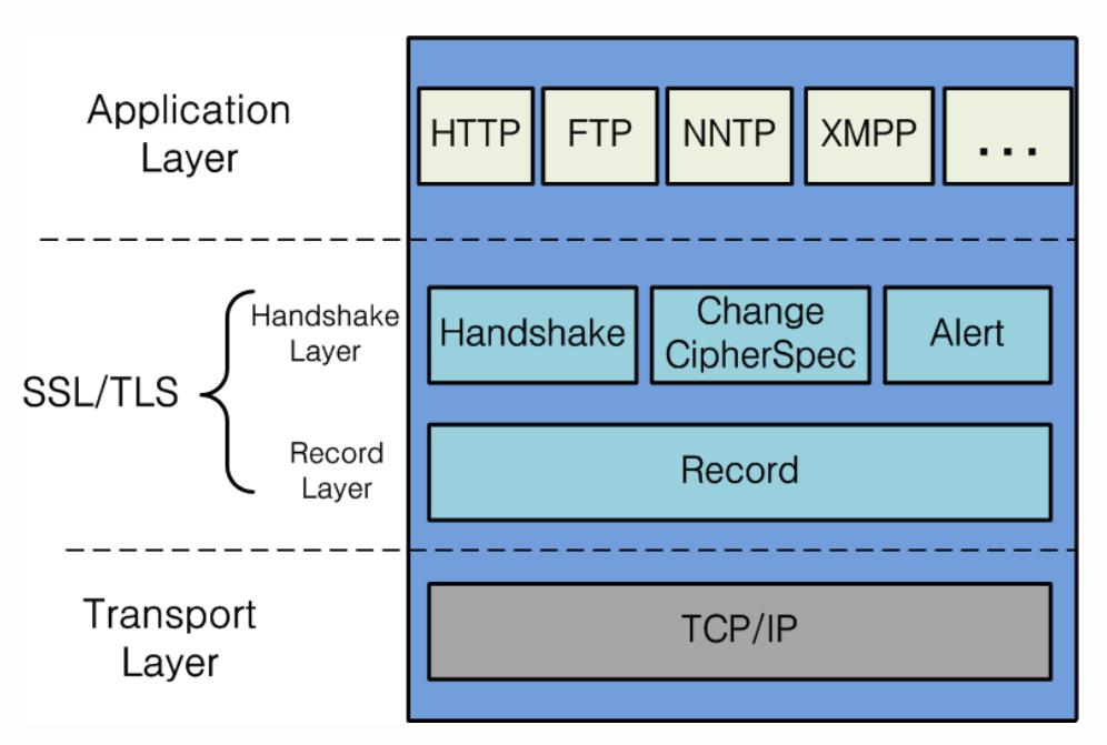 따라서 TLS는 주로 위의 그림처럼 응용 계층과 전송 계층 사이의 보안 계층으로 표현된다.