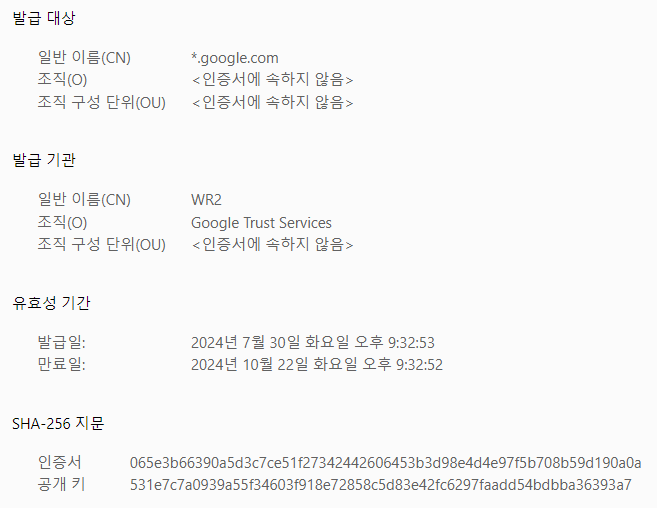 위의 예시에서 발급자는 Google Trust Services, 소유자는 *.google.com, 유효 기간은 발급일과 만료일이 명시되어 있고, 서명 알고리즘은 SHA-256로 적혀있다. 인증서의 지문 또한 확인할 수 있다.