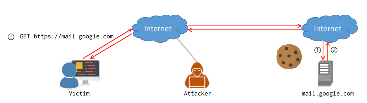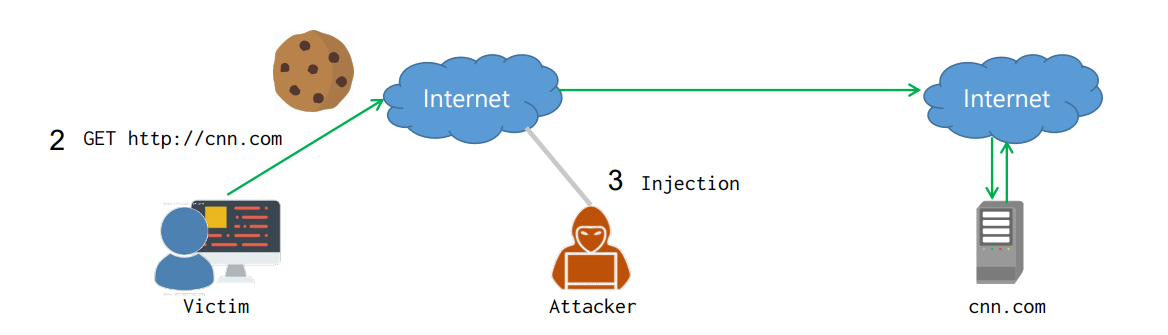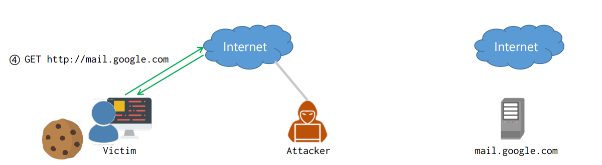 이 때, 네트워크 공격자는 http://cnn.com 웹사이트의 응답에 악성 코드를 삽입할 수 있다. (cnn은 안전하지 않은 HTTP 연결을 사용하고 있으므로!) <img src=http://mail.google.com/mail>이라는 악성 코드를 삽입했다고 가정하자. (악성 코드를 http라고 적었다는 점에 집중하자!)