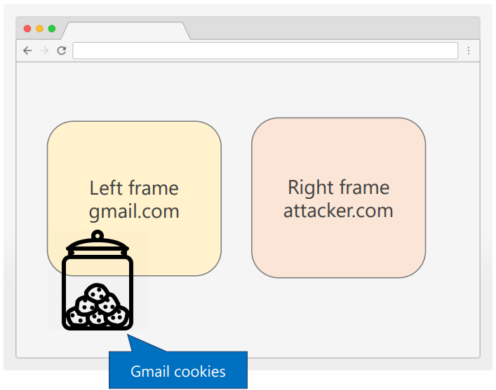 공격자의 웹 페이지에서 악성 JavaScript가 실행되면, 이 스크립트는 gmail 페이지의 프레임에 접근하여, 사용자의 gmail 쿠키를 읽을 수 있다.