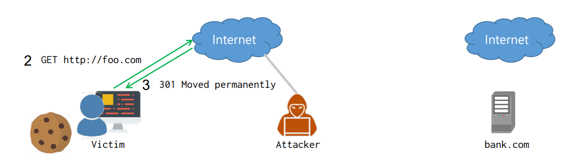 http://foo.com이 http://bank.com으로 리디렉션되었다고 인식한다. 결과적으로, 브라우저는 새로 HTTP 연결을 설정하여 http://bank.com으로 요청을 보내게 되고, 쿠키를 암호화하지 않고 평문으로 전송하게 된다.위와 같은 공격은 목표 사이트(예시의 경우 google)에서 HTTP 연결 자체를 허용하지 않는 방식으로 방어할 수 있다.