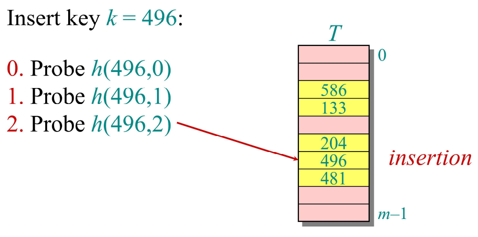 Open Addressing은 해시 테이블에서 충돌을 해결하는 또 다른 방법으로, 별도의 공간이나 연결 리스트를 사용하지 않고, 해시 테이블의 빈 버킷에 데이터를 저장하는 방식이다. Open Addressing은 충돌이 발생할 경우 탐사(Probing)과정을 통해 다른 빈 버킷을 찾는다. 위의 그림에서 볼 수 있듯이, 496이라는 key를 저장하기 위해 먼저 h(496, 0)을 수행한다. (여기서 0은 probing number로, 첫 번째 시도의 경우 해당 파라미터는 0이 된다.) 해당 위치에서 collision이 발생하면 probing number를 1씩 증가시키며 빈 버킷을 찾을 때까지 탐사를 반복한다. 위의 예시에서는 h(496, 2) 결과 빈 버킷에 도달한 것을 볼 수 있다.