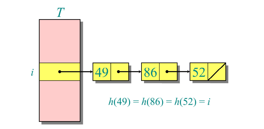 Chaining은 해시 테이블에서 충돌을 해결하는 한 방법으로, 동일한 해시 값을 가지는 여러 키를 연결 리스트로 관리하는 방식이다. 위의 그림과 같이, 해시 함수 h를 49, 86, 52에 적용한 결과가 모두 i로 같을 경우, 해당 버킷의 연결 리스트에 새로운 노드를 추가하는 방식으로 데이터를 저장한다.