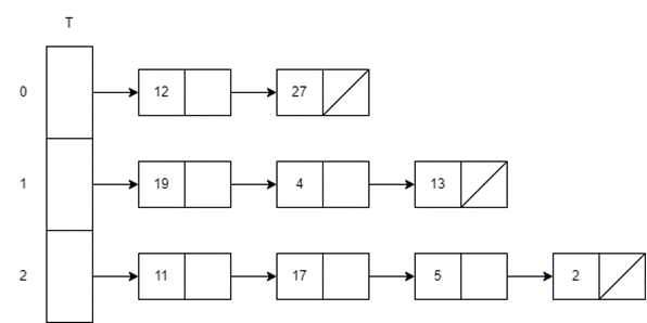 해시 함수 h(k)=k mod m일 때 (k를 m으로 나눈 나머지), Chaining 기법을 사용하여 길이가 3인 해시 테이블에 12, 11, 17, 5, 19, 27, 4, 2, 13을 순차적으로 삽입하는 예시.