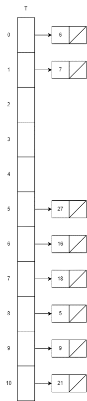 해시 함수 h′(k)=k mod m일 때, Open Addressing 기법을 사용하여 길이가 11인 해시 테이블에 18, 9, 27, 16, 5, 21, 6, 7을 순차적으로 삽입하는 예시.