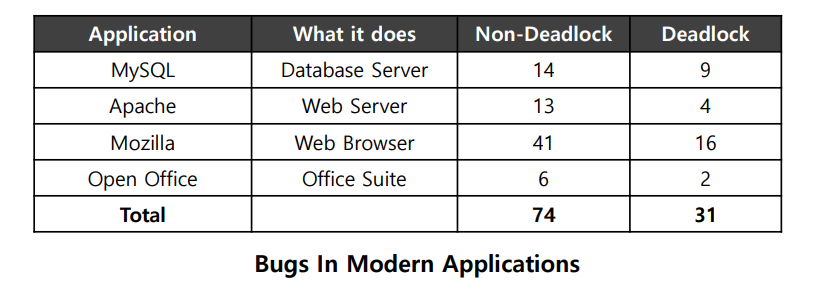 위의 표를 보면, Non-Deadlock 버그가 Deadlock 버그에 비해 두 배나 많다는 것을 볼 수 있다.