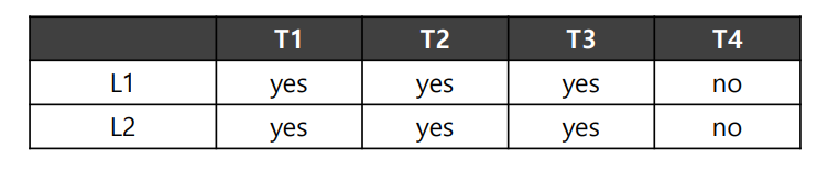 위의 표는 각 스레드가 요구하는 Lock(L1, L2)를 보여준다. L1과 L2를 모두 필요로 하는 스레드는 T1과 T2 뿐이므로, T1과 T2가 병렬 실행되지만 않으면 Deadlock은 절대 발생하지 않는다!