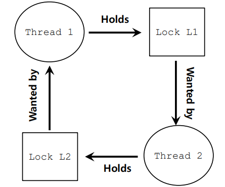 스레드가 점유한 자원은 강제로 뺏을 수 없기 때문에, 하나의 스레드는 L1을, 다른 스레드는 L2를 쥐고 놓지 않는 교착 상태에 빠지게 될 수 있다.