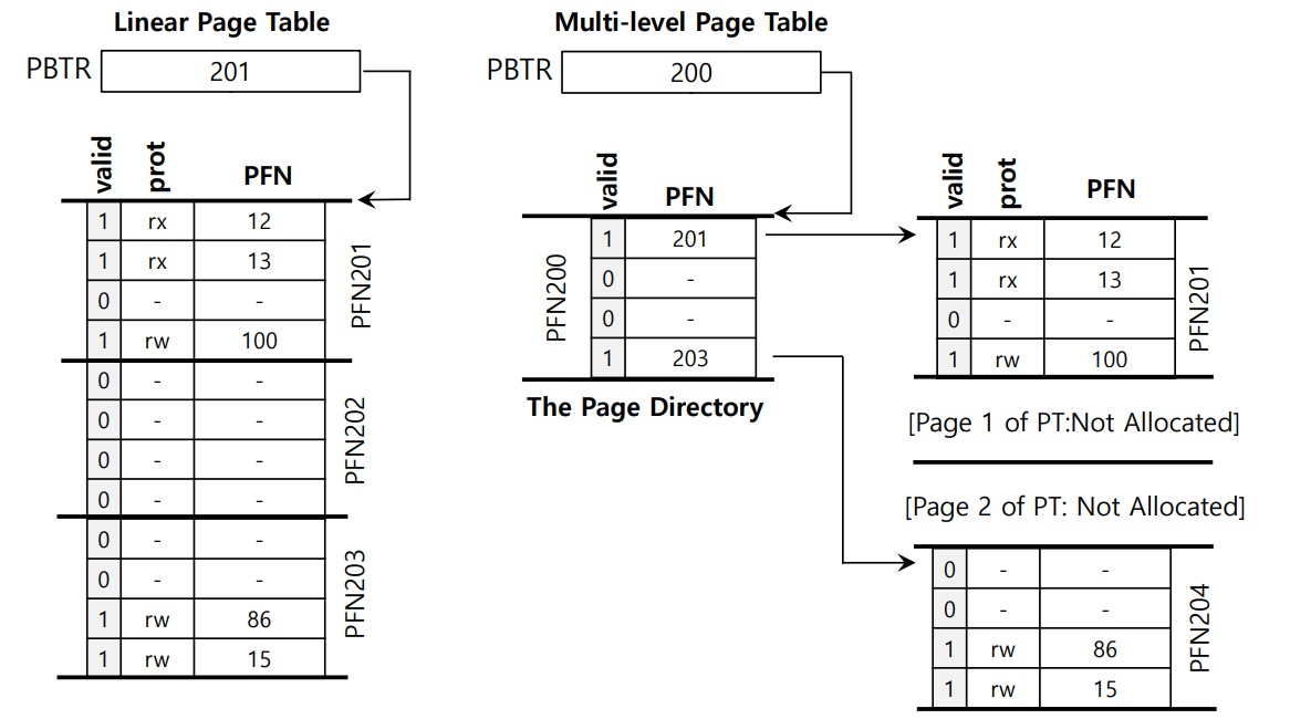 페이지 테이블이 여러 레벨로 나누어지기 때문에 각 레벨이 유효한지 추적해야 하는데, 이를 위해 Page Directory라는 새로운 자료 구조가 사용된다. 페이지 디렉토리는 여러 개의 Page Directory Entry로 구성되고, 각 페이지 디렉토리 엔트리는 해당 PFN이 유효한지 추적하는 valid 비트를 갖고 있다.