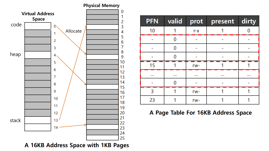 예시의 프로세스는 code, heap, stack 영역을 합해 단 4개의 페이지만 사용하고 있지만, 이를 관리하기 위해 16개의 페이지 테이블을 사용하고 있는 것을 볼 수 있다!
