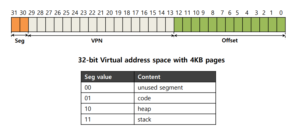 주목해서 볼 부분은 맨 앞의 Seg 비트이다. 01은 code, 10은 heap, 11은 stack으로 식별하여, 한 프로세스 당 세그먼트 별로 3개의 페이지 테이블을 할당받게 된다. 하드웨어는 Seg 비트에 따라 어떤 Base & Bounds 페어를 사용할지 결정하게 된다.
