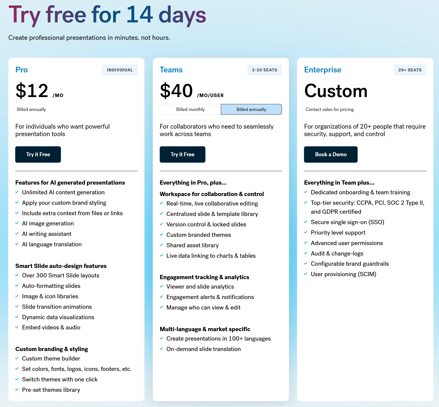 | Team | 팀 및 중소기업 | 사용자당 40달러부터 | Pro의 모든 기능 포함, 팀 전용 슬라이드 라이브러리, 공동 편집 및 댓글 기능, 브랜드 관리, 통합 분석, 우선 지원 |