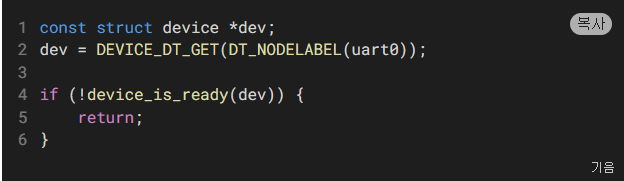 DEVICE_DT_GET() 매크로를 사용해 디바이스 포인터를 얻습니다.