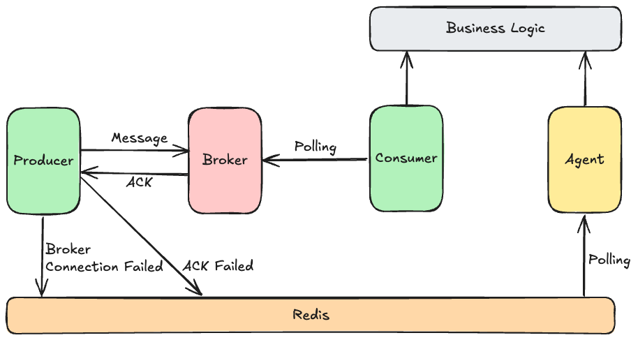 만약 브로커 서버에 장애가 발생해 접속 지연이 생기면 콜백을 통한 예외 처리만으로는 한계가 있어 메시징 시스템 전체에 영향을 줄 수 있습니다. 이를 대비해 Kafka 대신 외부 저장소에 메시지를 임시 저장하고 별도 에이전트가 이를 주기적으로 폴링해 카프카로 전송하는 구조로 전환하면 일시적인 브로커 장애에도 안정적으로 대응할 수 있습니다.