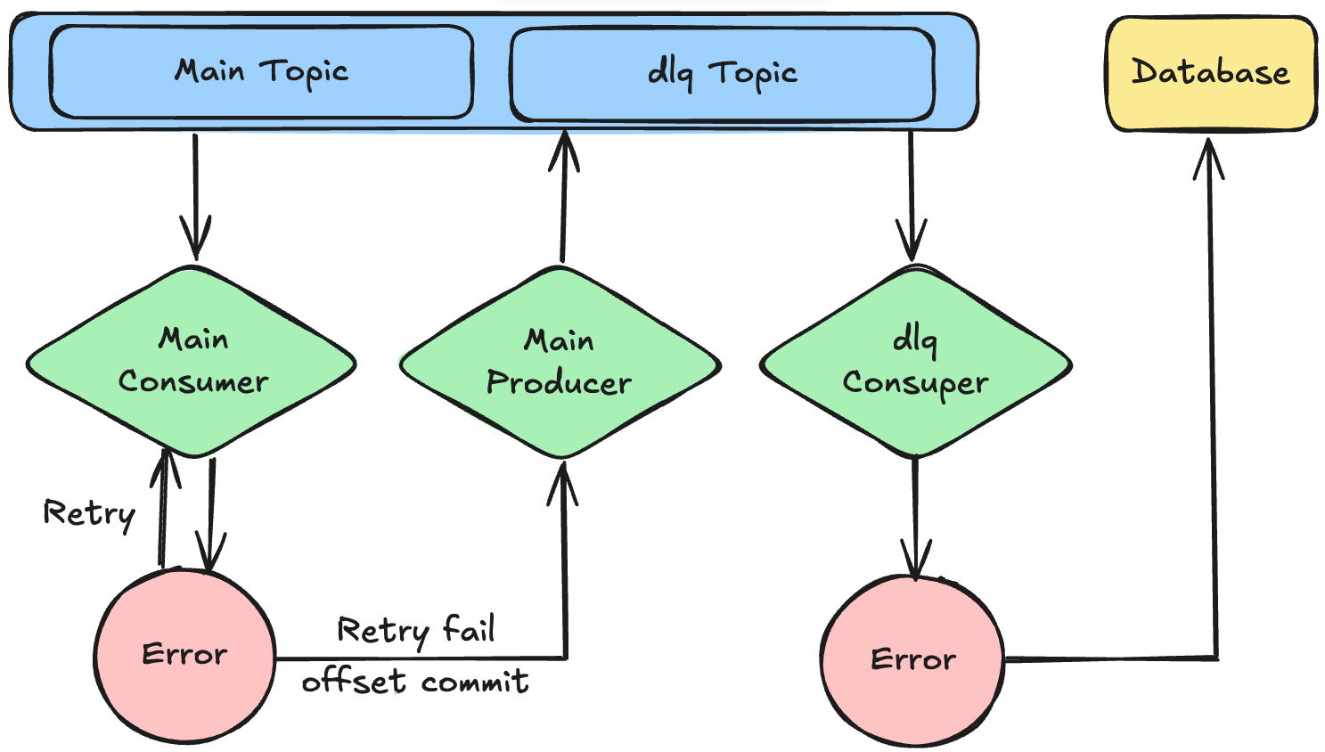 일반적으로 메인 컨슈머는 네트워크 장애 등 일시적인 이슈에 대응하기 위해 일정 횟수 재시도를 수행한 후 최종적으로 실패한 메시지를 DLQ 토픽에 저장하고 offset을 커밋합니다.