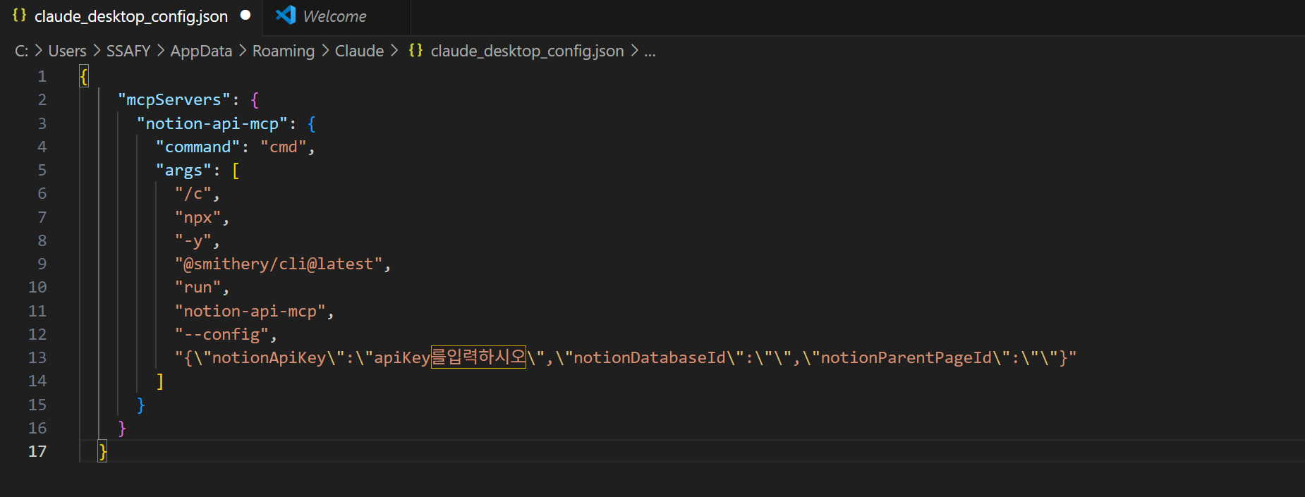 3. Claude에서 Json파일을 등록한다.