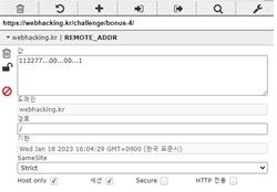 REMOTE_ADDR 라는 이름으로 112277...00...00...1 값을 갖는 쿠키를 만들어주면 문제가 풀린다.