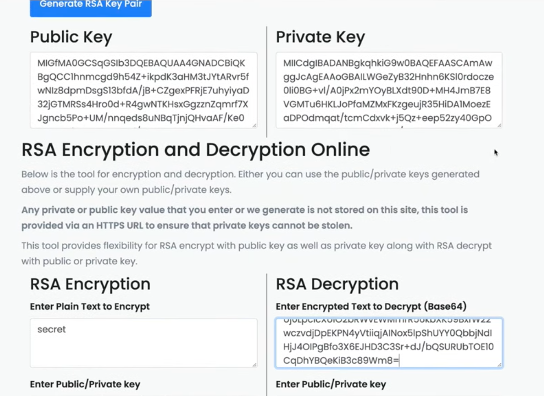 B는 자신의 메세지를 A에게 안전하게 보내고 싶다. 이를 감청하고 싶은 크래커가 있을 때, A는 비대칭키를 이용해 공개키와 비공개키 두 개를 만든 후 공개키를 인터넷에 올린다. 이 공개키를 B가 받고, 크래커도 공개키를 받을 것이다. 이 상황에서 B는 자신의 비밀 메세지를 A의 공개키로 암호화한다. 이렇게 생긴 암호문을 공개한다. A와 크래커 모두 암호화된 정보를 얻게 되지만, A는 자신이 가진 비공개키를 이용해 복호화할 수 있지만 크래커는 비공개키를 갖고 있지 않게 되기 때문에 복호화가 불가능하게 된다.