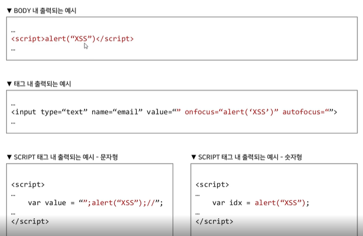 첫번째가 일반적으로 많이 발생하는 예시로 문서 내 태그 내에 있는게 아닌 순수 사용자 데이터가 출력되는 경우 -> script나 다른 태그를 사용해줘야 하기 때문에 반드시 꺾새 필요
