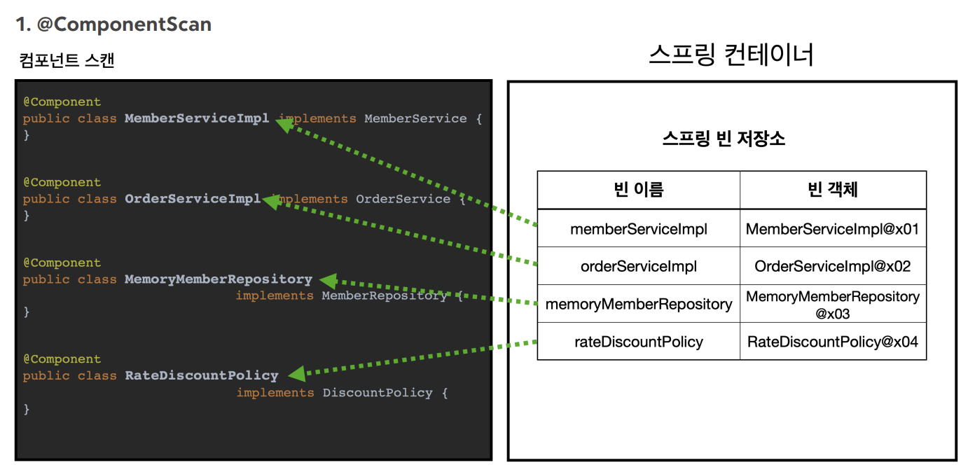 @ComponentScan은 스프링 컨테이너가 @Component가 붙은 모든 클래스를 스프링 빈으로 등록한다.