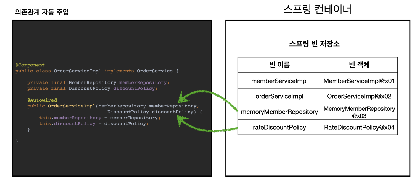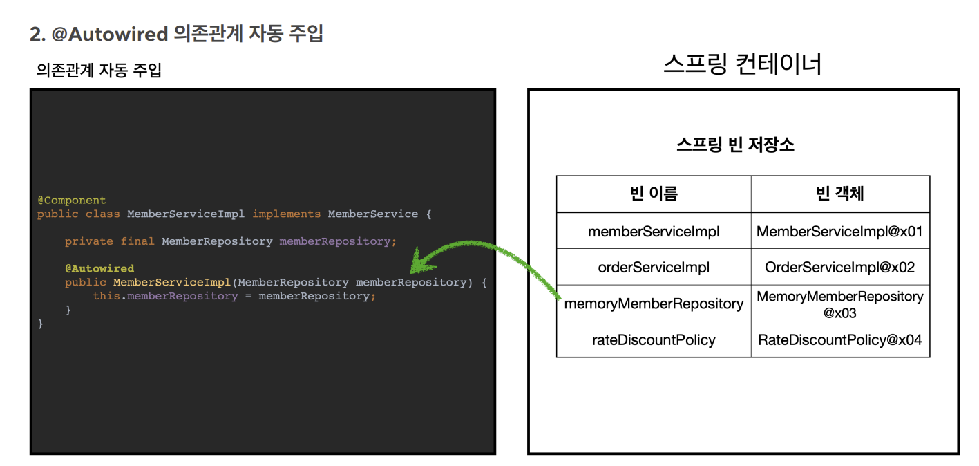위의 그림에서 MemberServiceImpl에 @Autowired를 지정해 줌 -> 스프링은 스프링 컨테이너에 있는 memberRepository와 같은 타입의 빈을 찾아 관계를 주입해 줌