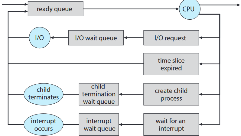 프로세스 스케줄링을 보통 표현할 때 큐 다이어그램 queueing diagram으로 표현. 아래 그림 참고. 그림에 보면 준비 상태 큐랑 몇 개의 대기 상태 큐가 있음. 동그라미가 큐를 처리할 자원, 화살표가 시스템 내에서 프로세스의 흐름.
