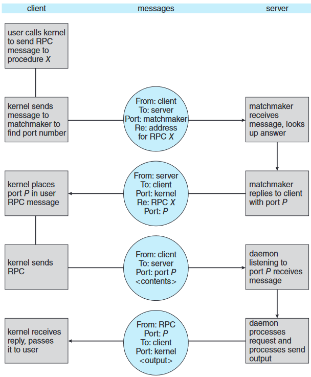 소켓 간 통신이 흔하고 효율적이지만 분산 프로세스 간 통신의 저수준 형태로 간주. 소켓이 오로지 구조화되지 않은 바이트의 스트림이 통신 스레드 간 교환되기 때문. 클라이언트나 서버가 그 자료를 구조화해야 함. 좀 더 고수준 통신법이 원격 프로시저 호출(RPC).